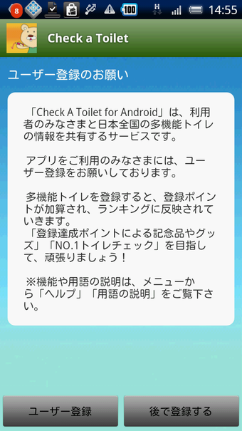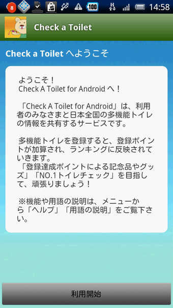 Check a Toilet for Android(チェック ア トイレット フォー アンドロイド)は、ユーザーが投稿した多機能トイレ情報を掲載する無料の公共多機能トイレマップです。全国の高齢者や障がい者、乳児の保護者などが外出先で簡単にベビーシートやスロープなどの設備付きのトイレを探せるようにと作られています。もちろんそれ以外の人でも、必要なときにすぐ近辺の多機能トイレを探せます。情報提供者は自治体などのトイレ管理者とユーザーです。プチボランティア感覚で多機能トイレ情報の拡充に協力してみてはいかがでしょうか。